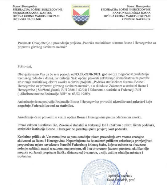 U periodu od 03. 05. do 22. 06. 2021. godine na prostoru Općine Gornji Vakuf-Uskoplje provest će se anketiranje domaćinstava za potrebe ažuriranja statističkog okvira uzorka u okviru projekta “Podrška statisitičkom sistemu Bosne i Hercegovine za pripremu glavnog okvira za uzorak”.