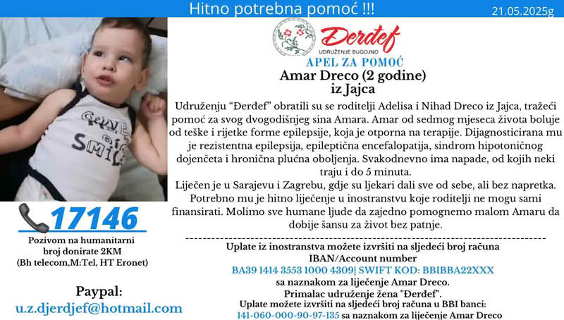 Udruženje Đerđef Bugojno pokrenulo Apel za pomoć u liječenju dvogodišnjeg dječaka iz Jajca.