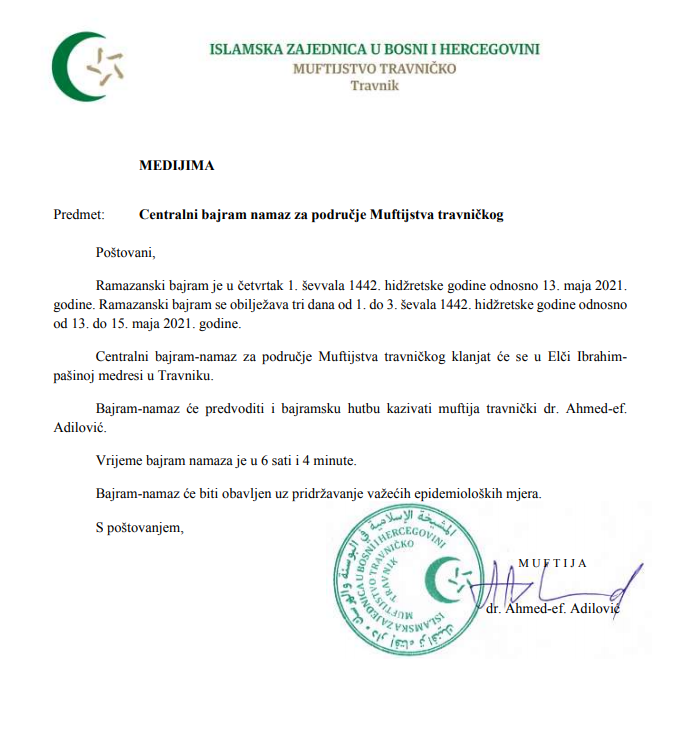 Centralni bajram – namaz za područje Muftijstva travničkog