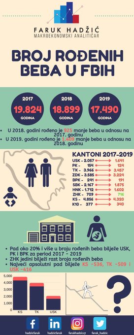 Makroekonomski analitičar Faruk Hadžić objavio je na Twitteru statistiku novorođenih beba u Federaciji BiH od 2017. do 2019. godine, upozorivši da je riječ o katastrofalnim posljedicama.