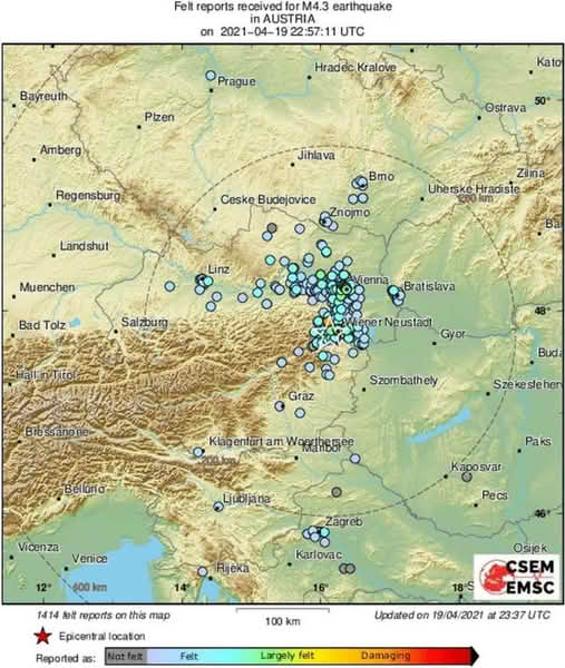 Potres magnitude 4,3 Richtera po skali zatresao je tokom noći Austriju. Kako javlja EMSC, epicentar potresa bio je 50 kilometara od Beča.