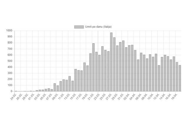 Prema podacima Civilne zaštite Italije, u posljednja 24 sata preminulo je 433 osobe. Italija je ukupno do sada registrovala 178.972 osoba zaraženih koronavirusom.