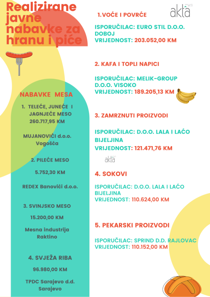 Nabavka svježeg pilećeg mesa bila je raspisana u februaru prošle godine. Isporuku vrijednu 5.752,30 KM dobila je firma REDEX Banovići d.o.o. Zatim, za svinjsko meso je izvojeno 15.200,00 KM, a isporučila ga je Mesna industrija Raktino.