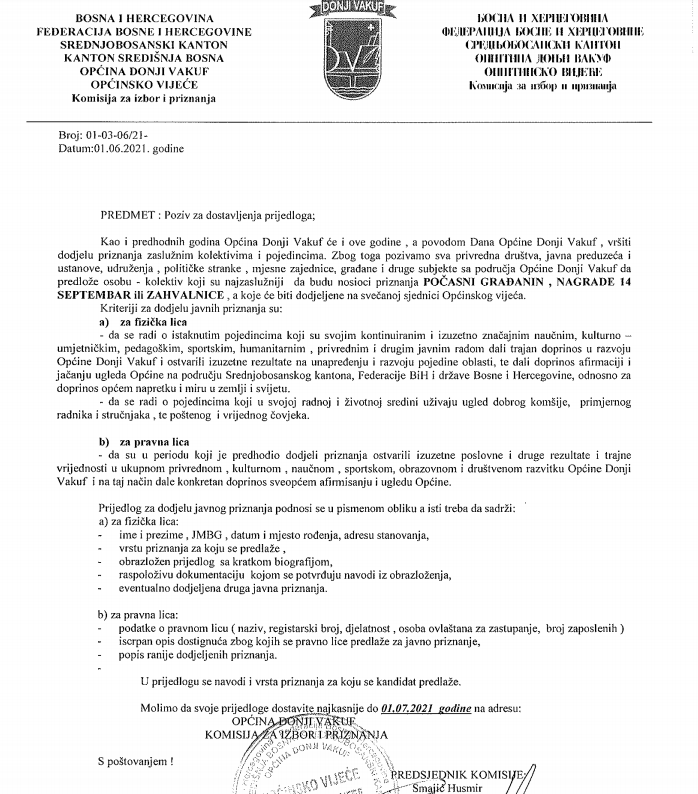 Javni poziv za dostavljanje prijedloga za dodjelu priznanja zaslužnim kolektivima i pojedincima u povodu Dana općine Donji Vakuf.