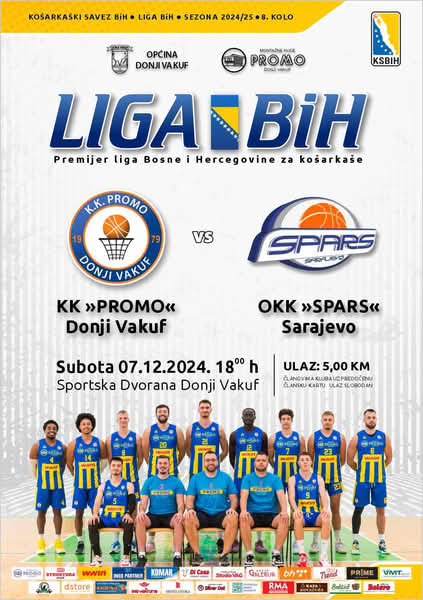 U okviru 8. kolo Prvenstva BiH za košarkaše, a KK Promo ugostit će OKK Spars iz Sarajeva. Utakmica se odigrava u subota 7. Decembra u 18 sati, u Sportskoj dvorani Donji Vakuf !