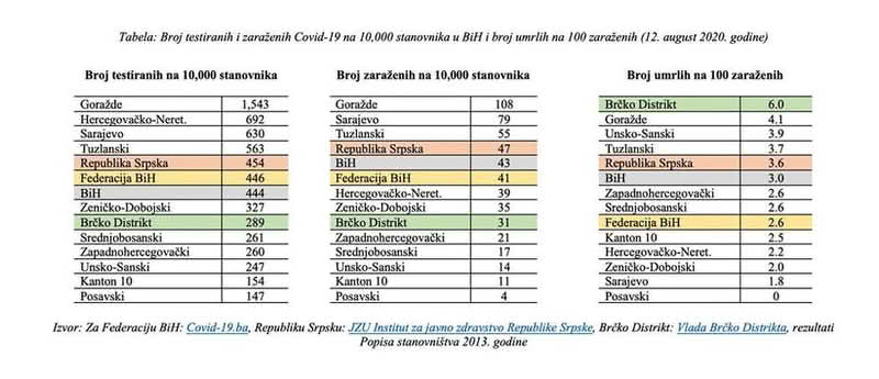 Republika Srpska je u odnosu na Federaciju Bosne i Hercegovine testirala više stanovništva, odnosno 454 stanovnika na 10.000 njih, dok je FBiH testirala 446. U sličnom omjeru prema 10.000 stanovnika Republika Srpska je imala i više novozaraženih.