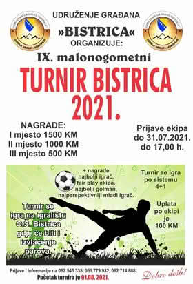 Udruženje građana Bistrica organizuje IX malonogometni turnir Bistrica 2021. godine. Prijave ekipa vrše se do 31.jula 2021. godine,a turnir će se odigravati od 1. 08. 2021. godine.