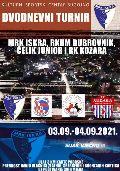 U sklopu završnoga dijela priprema MRK Iskra Bugojno organizira dvodnevni turnir koji će se održati 03.09. i 04.09.2021. u Sportskoj dvorani KSC u Bugojnu.