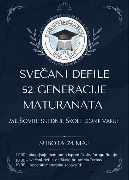 sa posebnim zadovoljstvom i ponosom vas pozivamo da zajedno ispratimo 52. generaciju maturanata Mješovite srednje škole Donji Vakuf na njihovom putu ka novim životnim izazovima.
