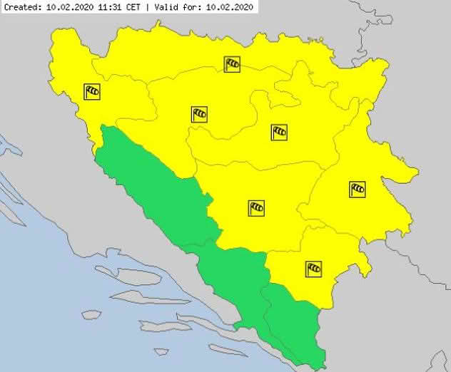 Sinoptička karta koja pokazuje područja u BiH za koja je izdato žuto upozorenje za danas (Foto: FHMZ)