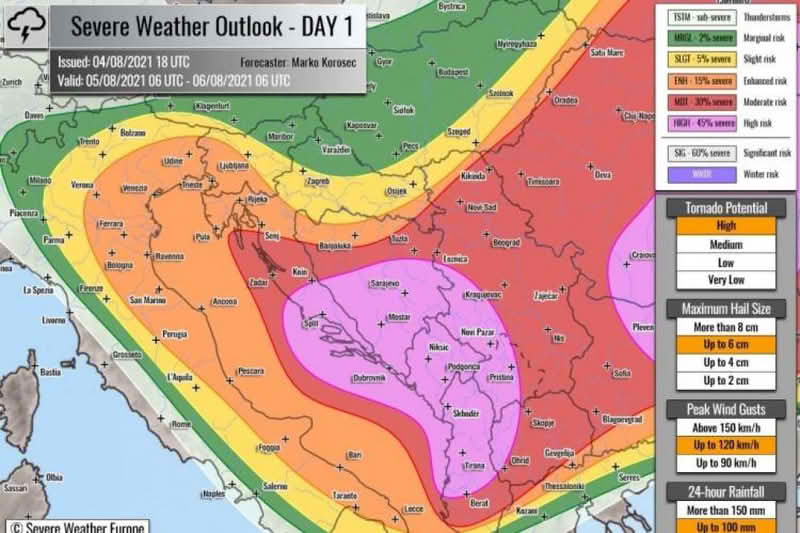 U većem riziku od nevremena su sjever Bosne i Hercegovine, zapad Hrvatske, veći dio Srbije, zapad Slovenije, dijelovi Albanije, Sjeverne Makedonije i Grčke. Njima prijete snažni vjetrovi, veliki grad, obilna kiša i tornado, navodi se na Severe Weather Europe, pišu Nezavisne.