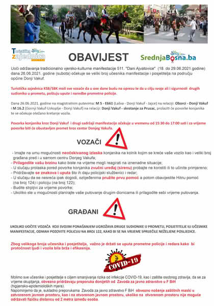 Obavijest vozačima o održavanju tradicionalno vjersko-kulturne manifestacije 511. “Dani Ajvatovice” (18. do 29.06.2021.godine).