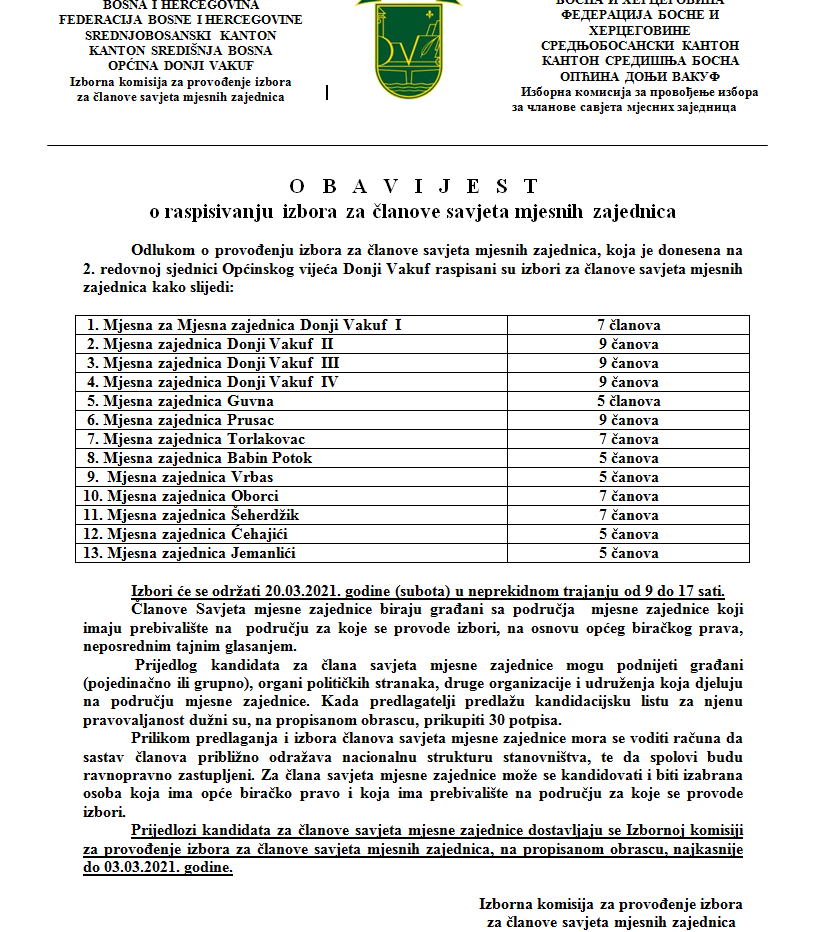 Obavještenje o raspisivanju izbora za članove savjeta mjesnih zajednica