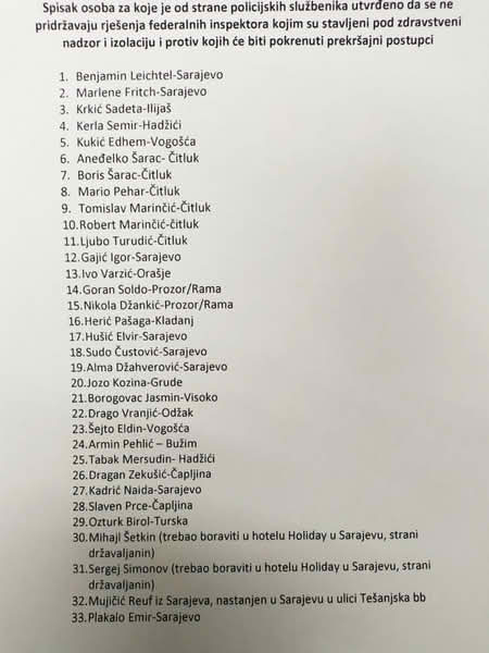 Federalna uprava za inspekcijske poslove objavila je spisak osoba protiv kojih će biti pokrenuti prekršajni postupci zbog kršenja mjera izolacije na području Federacije Bosne i Hercegovine. Uprkos konstantnim upozorenjima iz nadležnih institucija, kao i ljekara, pojedini građani postupaju nesavjesno.