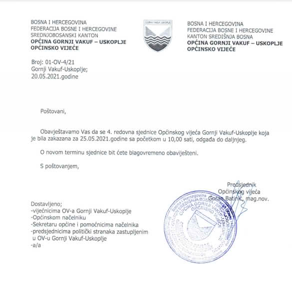 Obavijest Predsjednika općinskog vijeća Gornji Vakuf – Uskoplje o odgodi 4. sjednice Općinskog vijeća koja je bila zakazana za 25. 05.2021. godine