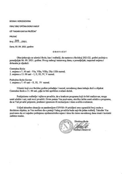 OŠ Hasan Kjafija Pruščak / Informacija o nastavnom procesu