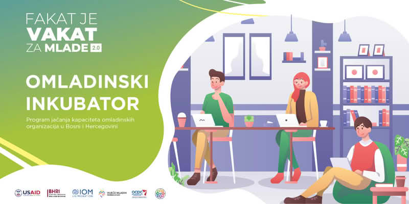 Omladinski inkubator – program jačanja kapaciteta omladinskih organizacija u Bosni i Hercegovini dio je projekta Fakat je vakat za mlade 2.0 koji se implementira zahvaljujući podršci programa Bosnia and Herzegovina Resilience Initiative (BHRI), koji sprovodi Međunarodna organizacija za migracije (IOM), uz finansijsku podršku Američke agencije za međunarodni razvoj (USAID).