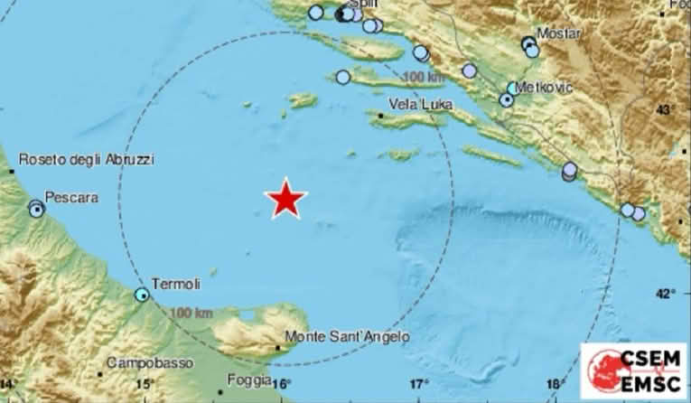 Potres se dogodio 68 kilometara od talijanskog Viesta i 120 kilometara od Splita