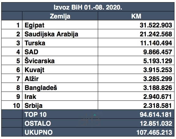 Prema podacima Vanjskotrgovinske komore BiH, najveća vrijednost izvoza ostvarena je u Egipat, i to u vrijednosti od 31,5 miliona KM.