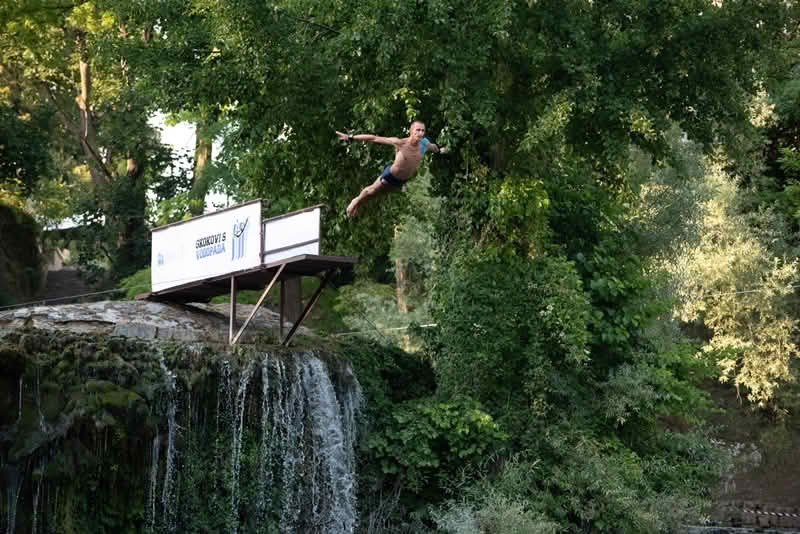 Vodopad Plive u Jajcu, visok više od 20 metara, ugostio je jedinstvenu sportsko-turističku manifestaciju Međunarodnih takmičarskih skokova s vodopada, nakon godine pauze prouzrokovane pandemijom COVID-19.
