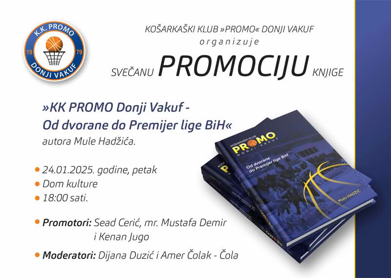 U petak, 24. februara 2025. godine zgradi Doma kulture u Donjem Vakufu održat će se promocija druge knjige Mule Hadžića o KK Promo Donji Vakuf a, koja nosi naziv: „Od dvorane do Premijer lige BiH“.