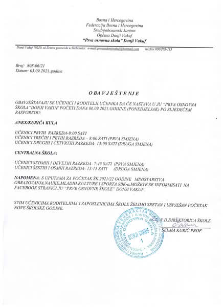 Prva OŠ Donji Vakuf: Obavještenje o početku nastave i rasporedu smjena