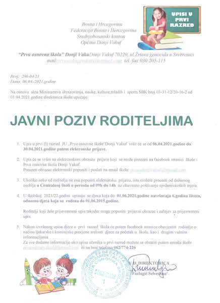 Na osnovu akta Ministarstva obrazovanja, nauke,kulture,mladih i sporta SBK, od 1.04.2021. godine, direktorica JU Prva osnovna škola Donji Vakuf, uputila je javni poziv roditeljima za upis djece u prvi razred osnovne škole.