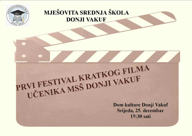 U srijedu, 25. decembra, u Domu kulture Donji Vakuf u okviru manifestacije „ Zimska čarolija“ održat će se Prvi festival kratkog filma učenika MSŠ Donji Vakuf. Ukupno će biti prikazano pet filmova koji su u potpunosti autorski rad učenika, a na kraju će stručni žiri proglasiti najbolje u različitim kategorijama. Ovaj događaj, koji se po prvi put organizuje u donjovakufskoj srednjoj školi, pripremili su članovi Aktiva bosanskog jezika i književnosti.