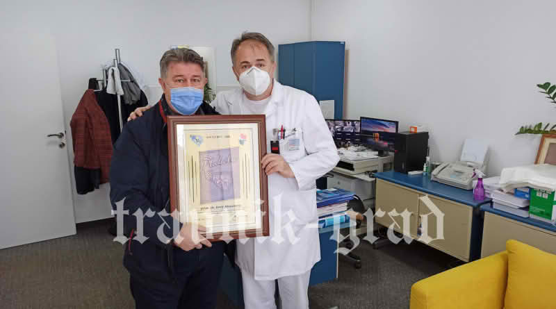 Predsjednik Saveza ratnih vojnih invalida SBK (Savez RVI SBK),Ekrem Julardžija uručio je danas zahvalnicu prim.dr. Emiru Abduloviću, direktoru Bolnice za plućne bolesti i TBC u Travniku za izuzetan doprinos koji je ova ustanova dala u vrijeme pandemije korona virusa u liječenju članova Saveza RVI SBK.