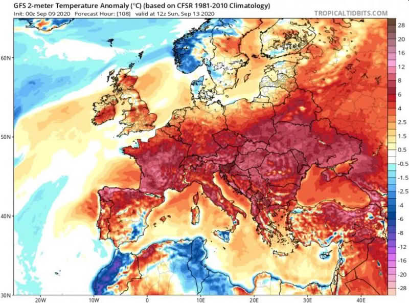 Topla advekcija, počinje u subotu, i širi se s juga na sjever u nedjelju. Prvo kroz centralnu, istočnu i zapadnu Europu.
