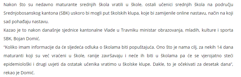 Nakon što su se nedavno maturanti vratili u škole, i ostali učenici srednjih škola na području Srednjobosanskog kantona uskoro bi mogli put školskih klupa. Na taj način online nastvu zamijenili bi uobičajnim odvijanjem nastavnog procesa.