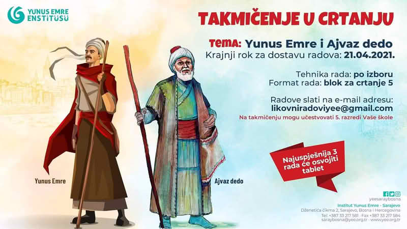 Institut Yunus Emre Sarajevo poziva učenike 5. (petih) razreda da učestvuju na takmičenju za najbolji likovni rad na temu: “Yunus Emre i Ajvaz dedo”.