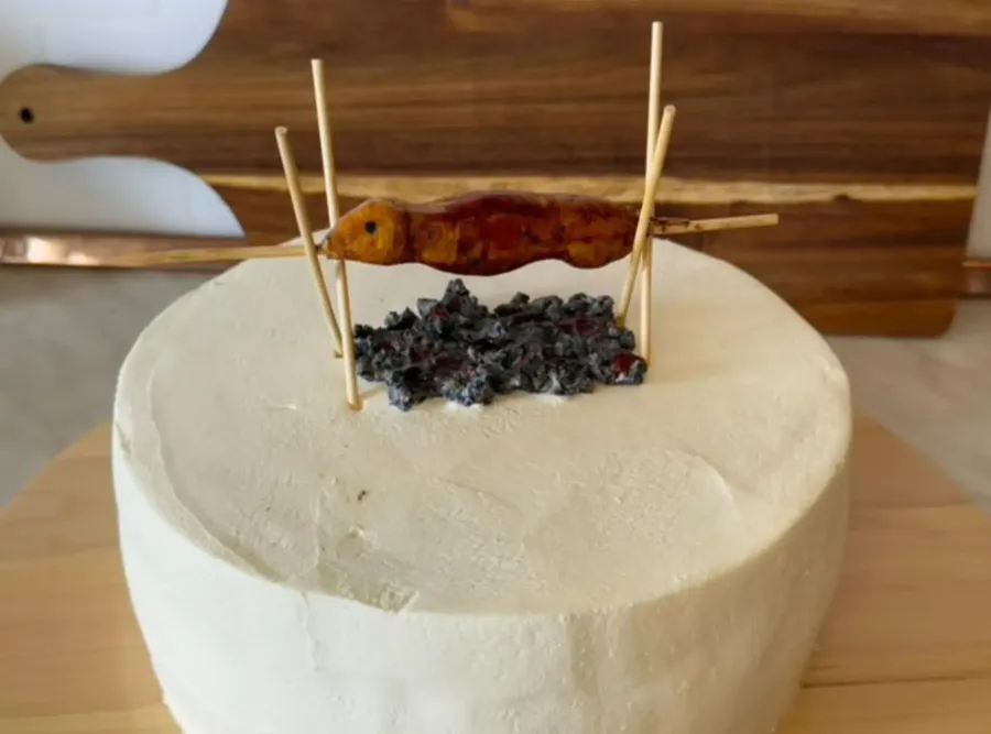 Rješenje je našla u komadu goude koji je strpljivo izrezuckali nožićem u oblik janjeta na ražnju. Žeravicu je napravila od sitno sjeckanog kikirikija obojenog sivom i crvenom prehrambenom bojom.