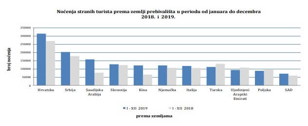U strukturi noćenja stranih turista najviše noćenja ostvarili su turisti iz Hrvatske (13%), Srbije (8,4%), Saudijske Arabije (6,5%), Slovenije (5,3%), Kine i Njemačke (sa po 5%), Italije (4,9%), Turske (4,6%), Ujedinjenih Arapskih Emirata (3,9%), Poljske (3,7%) i SAD (3%).