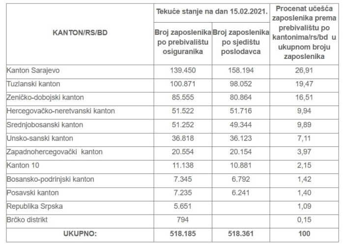 Ukupan broj zaposlenih u Federaciji BiH na dan 15.02.2021. godine prema prebivalištu zaposlenika iznosio je 518.185, objavljeno je iz Porezne uprave FBiH.