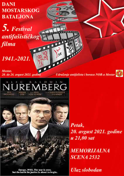 Večeras na Memorijalnoj sceni 2532 sa početkom u 21,00 sat počinje 5. Festival antifašističkog filma koji se održava u okviru Dana Mostarskog bataljona. Cjelokupna manifestacija se organizuje u znak sjećanja na događaje od prije 80 godina kada je mladost Mostara krenula u borbu za slobodu. U narednih sedam dana zainteresirani će moći vidjeti 7 filmova koji na različite načine tretiraju pojavne oblike fašizma i posljedice koje on ostavlja. Prvo festivalsko veče posvećeno je kanadsko-američkom filmu iz 2000. godine nastalom iz tv serije iz dva dijela nastale po istoimenoj knjizi koja govori o suđenju nacistima iz 1945. godine. Redatelj filma je Yves Simoneau.
