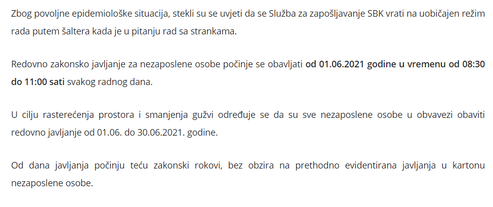Važna obavijest za nezaposlene osobe iz Službe za zapošljavanje SBK