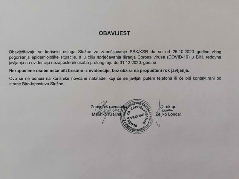 Služba za zapošljavanje SBK/KSB zbog pogoršanje epidemiološke situacije, a u cilju sprečavanja širenja Corona virusa obustavlja redovita javljanja nezaposlenih osoba.