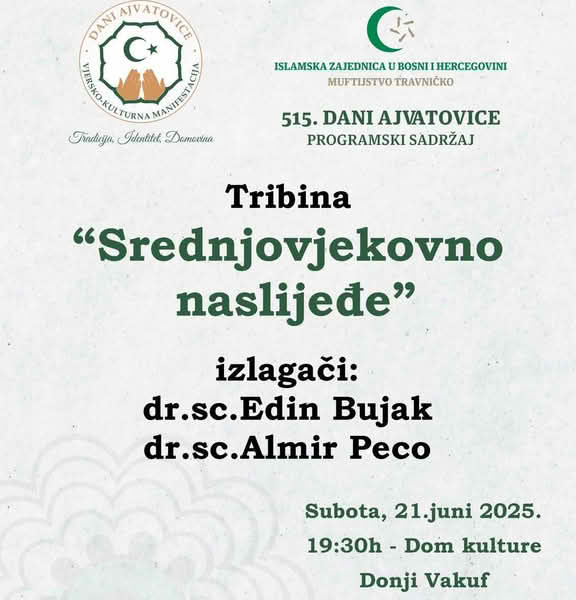 Naime od 19:30 sati u prostorijama Doma kulture Donji Vakuf bit će održana tribina pod nazivom “Srednjovjekovno nasljeđe”. Izlagači su: dr. sc. Edin Bujak i dr. sc. Almir Peco.