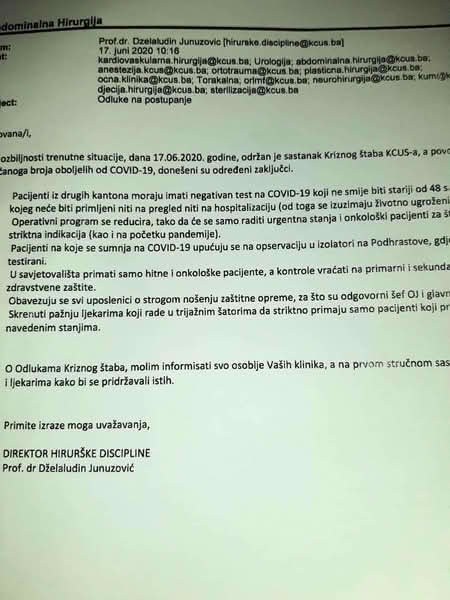 – Pacijenti iz drugih kantona moraju imati negativan test na Covid-19, koji ne smije biti stariji od 48 sati i bez kojeg neće biti primljeni niti na pregled niti na hospitalizaciju (od toga se izuzimaju životno ugroženi pacijenti). Operativni program se reducira, tako da će se samo raditi urgentna stanja i onkološki pacijenti za šta postoji striktna indikacija (kao i na početku pandemije). Pacijenti na koje se sumnja na Covid-19 upućuju se na opservaciju u izolatorij na Podhrastove, gdje će biti testirani. U savjetovališta primati samo hitne i onkološke pacijente, a kontrole vraćati na primarni i sekundarni nivo zdravstvene zaštite – neki su od zaključaka koje je usvojio Krizni štab KCUS-a.